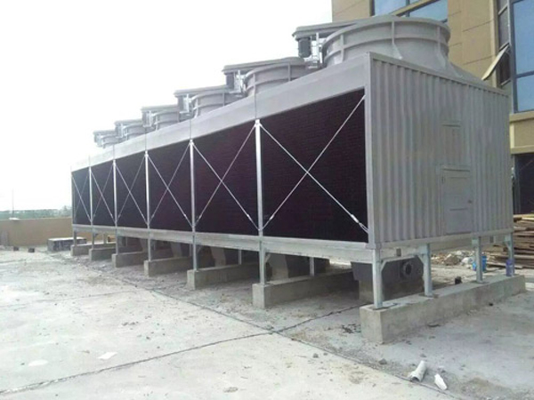 方形橫流式玻璃(lí)鋼冷卻塔采用兩側進風,靠頂部的風機,使空氣經由塔兩側的填料,與熱水進行介質交換,濕熱空氣再(zài)排向塔外。填料采用(yòng)兩麵有凸點的(de)點波片,通過安裝頭使點波片粘結成(chéng)整體,以(yǐ)提高剛性,兩麵(miàn)的凸點還可(kě)避免直接滴水,因此提高了水膜形(xíng)成能力,填料尾部設(shè)有收水措施(shī)。